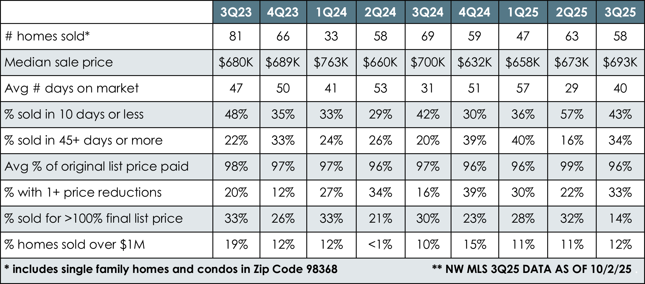 Comparing same period* 2025 sales to 2024, the volume of homes sold in Cape George rose 80% – it was a big year for sales here. The median price rose from $700K to $750K. The number of days on market also rose, however, with homes taking an average of 44 days to sell in 2025 versus 26 days in 2024. Notably, though, 40% of the homes sold within 10 days or less in 2025, versus 33% in 2024. A few homes still received multiple offers and sold for over the asking price. What was particularly striking was the percentage of cash sales in 2025: 72%. In 2024, that number was 50%, which was still almost double the national average of 26%, reflecting our target buyer demographic.