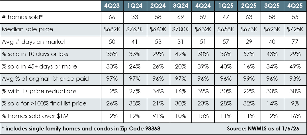 Comparing same period* 2025 sales to 2024, the volume of homes sold in Cape George rose 80% – it was a big year for sales here. The median price rose from $700K to $750K. The number of days on market also rose, however, with homes taking an average of 44 days to sell in 2025 versus 26 days in 2024. Notably, though, 40% of the homes sold within 10 days or less in 2025, versus 33% in 2024. A few homes still received multiple offers and sold for over the asking price. What was particularly striking was the percentage of cash sales in 2025: 72%. In 2024, that number was 50%, which was still almost double the national average of 26%, reflecting our target buyer demographic.